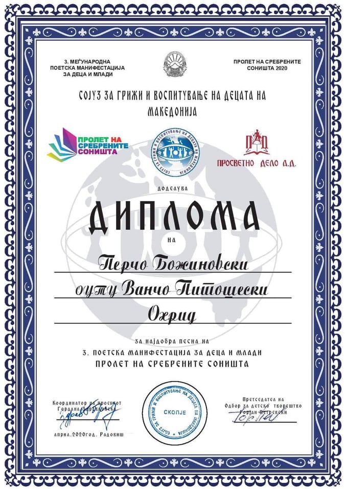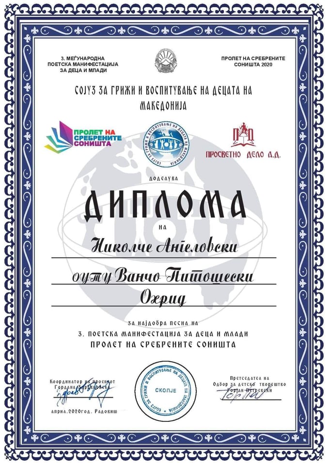 Први на листата наградени во категоријата средно образование на Третата Меѓународна поетска манифестација ,,Пролет на сребрените соништа”.